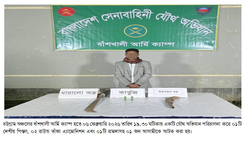 শুক্রবার (৬ ফেব্রুয়ারি) সন্ধ্যা সাড়ে ৭টার দিকে বাঁশখালী উপজেলার বাহারছড়া ইউনিয়নের ৬ নম্বর ওয়ার্ড এলাকায় অভিযানটি পরিচালনা করা হয়। আটক ব্যক্তি জামির উদ্দিন (৪০)। তিনি ওই এলাকার বাসিন্দা এবং পুলিশের তালিকাভুক্ত অপরাধী বলে জানিয়েছে সেনাবাহিনী।