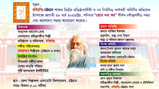 চট্টগ্রাম জেলা শিল্পকলা একাডেমি মিলনায়তনে বিকাল ৫টা থেকে আয়োজিত এ অনুষ্ঠানে উদ্বোধক হিসেবে উপস্থিত থাকবেন দেশবরেণ্য রবীন্দ্রসঙ্গীত শিল্পী ও রবিরশ্মির প্রতিষ্ঠাতা-পরিচালক অধ্যাপক মহাদেব ঘোষ।