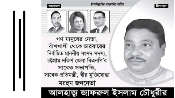 নিজস্ব প্রতিবেদক::: গণমানুষের নেতা, বাঁশখালী থেকে চারবারের নির্বাচিত সংসদ সদস্য, চট্টগ্রাম দক্ষিণ জেলা বিএনপি’র সাবেক সভাপতি, সাবেক প্রতিমন্ত্রী ও বীর মুক্তিযোদ্ধা মরহুম আলহাজ্ব জাফরুল ইসলাম চৌধুরী-এর স্মরণসভা অনুষ্ঠিত হবে আগামী
